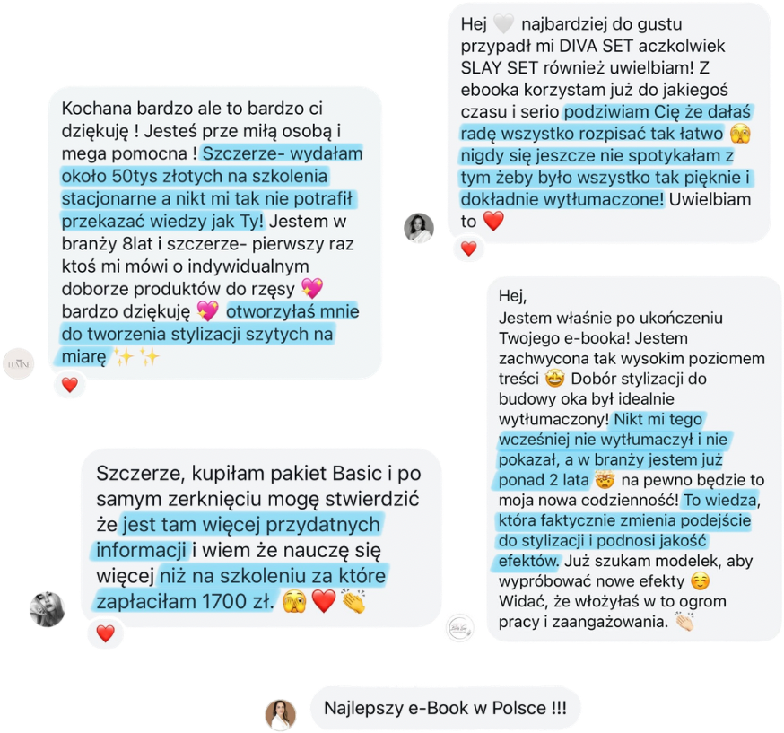 Na bazie swojego doświadczenia stworzyłam materiały edukacyjne, z których skorzystało już ponad 2000 stylistek rzęs. W opiniach bardzo często pojawia się jedno zdanie: że to jedne z najlepszych materiałów szkoleniowych, z jakimi miały do czynienia.